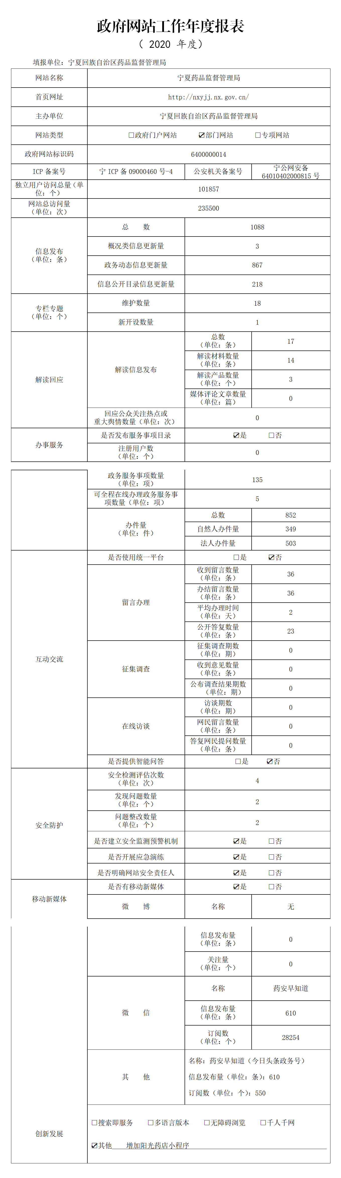 2020年度宁夏药品监督管理局政府网站年度工作报表